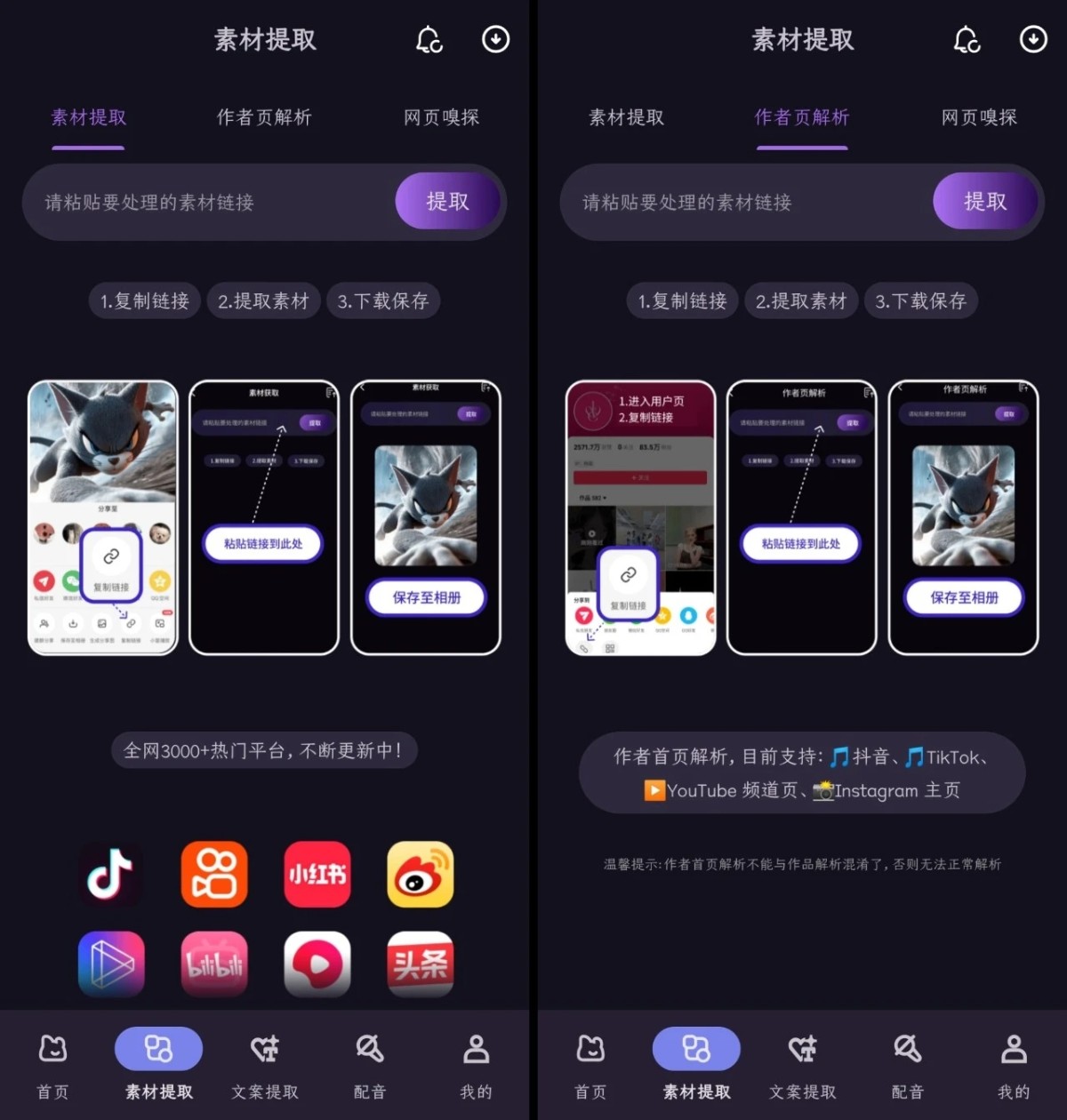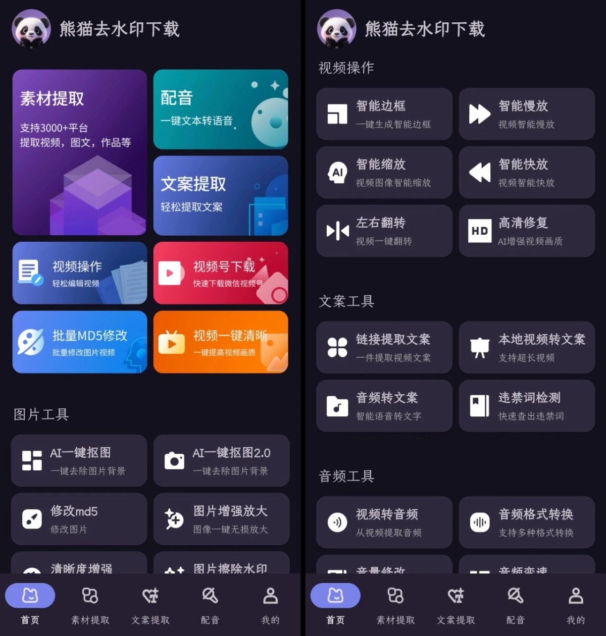 熊猫去水印下载,这是一款自媒体工具大全软件。支持3000+平台无水印提取视频、图片,还有配音、AI抠图、图片擦除水印、视频剪辑、AI无损放大图片... 等多种功能。老黑,尝试了多个平台,都可以解析下载,并且解析速度都非常快!还可以直接保存到手机相册。除此之外,还有很多视频二次创作功能,修改MD5、清晰度增强、左右翻转、智能缩放、智能边框、智能模糊、补帧... 等。