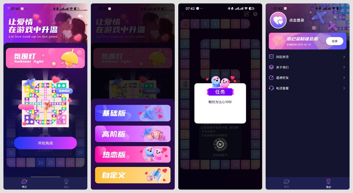 情侣私密互动日常是一个专为增进情侣间感情设计的应用。它包含两个主要功能:氛围灯和情侣飞行棋。通过氛围灯功能,在关灯后打开该功能即可营造出温馨浪漫的氛围,让彼此之间的亲密感倍增。而情侣飞行棋则提供了多种版本以适应不同阶段的情侣,从基础版到热恋版,每一步都充满了惊喜与乐趣。游戏规则简单易懂,双方轮流掷骰子,根据所落格子的任务进行挑战,任务内容既有趣又不失纯爱的本质。
