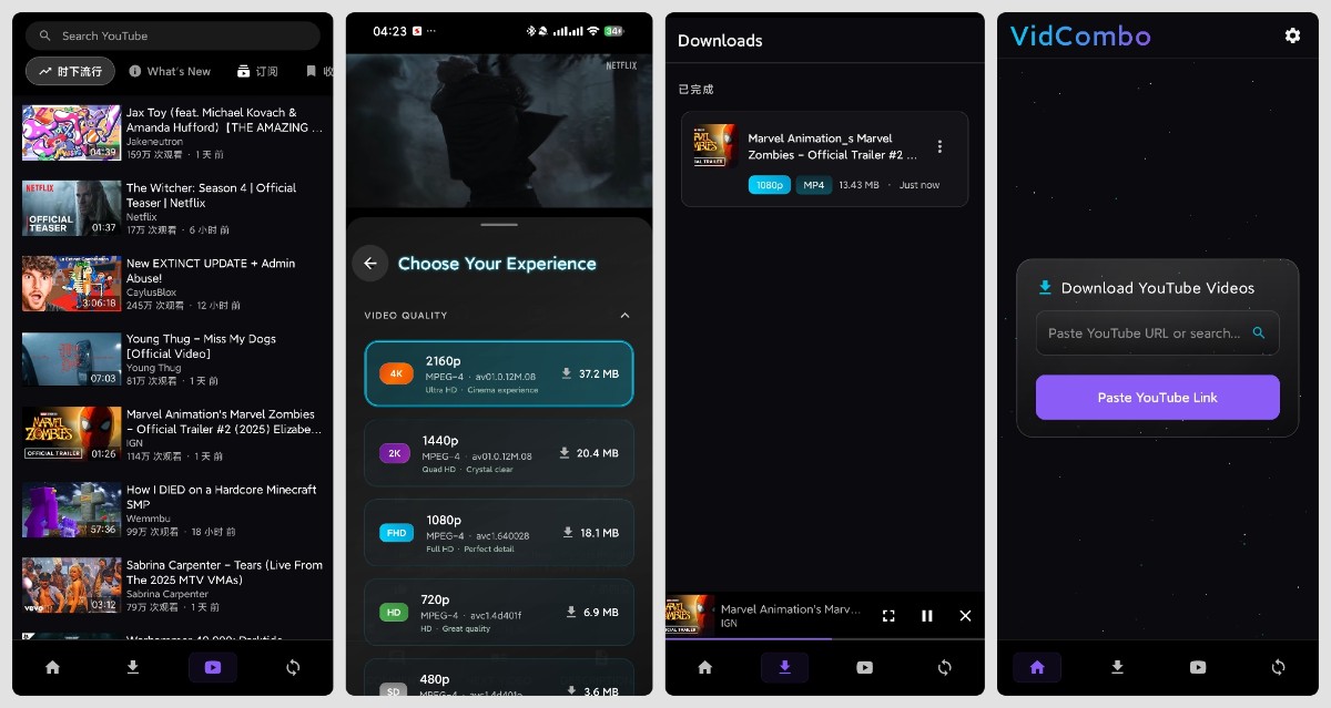 Vidcombo是一款专为YouTube设计的视频观看和下载工具,它允许用户无需登录即可轻松下载高达4K分辨率的视频。该应用界面简洁,操作方便,提供了纯净无广告的用户体验。