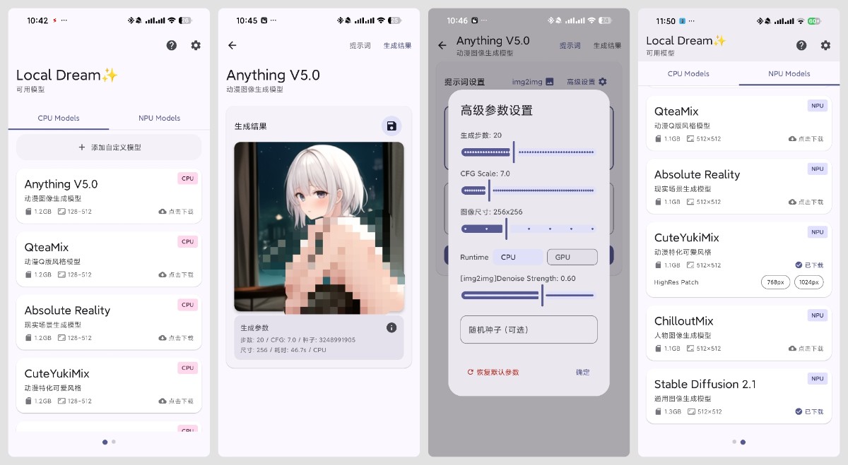 Local Dream是一款在Android设备上运行Stable Diffusion图像生成模型的应用程序。它不仅支持文本到图像的生成和图像重绘功能,还能利用高通Snapdragon NPU进行硬件加速,在无网络环境下实现快速AI图像生成。该应用支持CPU/GPU/NPU多模式推理,并兼容多种模型格式,使得用户可以根据自己的需求选择最适合的配置。用户还可以导入自定义模型并使用高分辨率补丁扩展,进一步提升图像质量和创作灵活性。无论是专业设计师还是普通用户,都能通过Local Dream轻松实现创意构想。