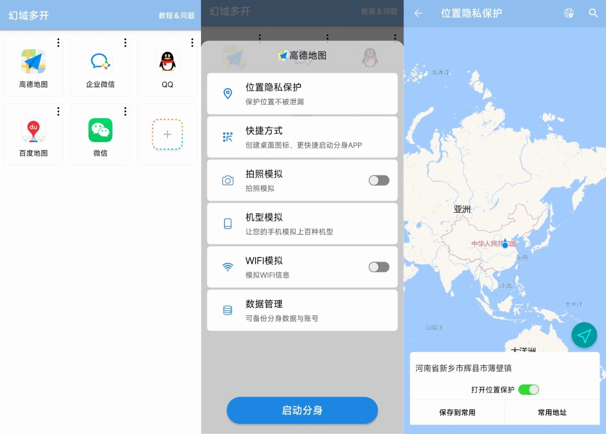 【应用简介】幻域多开是一款功能全面且用户友好的虚拟定位模拟工具,它集成了多项先进的功能,如虚拟系统、应用多开、WIFI保护、相机保护、定位保护等。这款软件以其强大的功能集合,为用户提供了一站式的解决方案,旨在满足不同用户在多样化场景下的需求