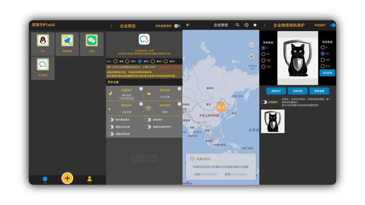【应用简介】黑猫守护是一款功能全面且用户友好的虚拟定位模拟工具,它集成了多项先进的功能,如虚拟系统、应用多开、WIFI保护、相机保护、定位保护等。这款软件以其强大的功能集合,为用户提供了一站式的解决方案,旨在满足不同用户在多样化场景下的需求
