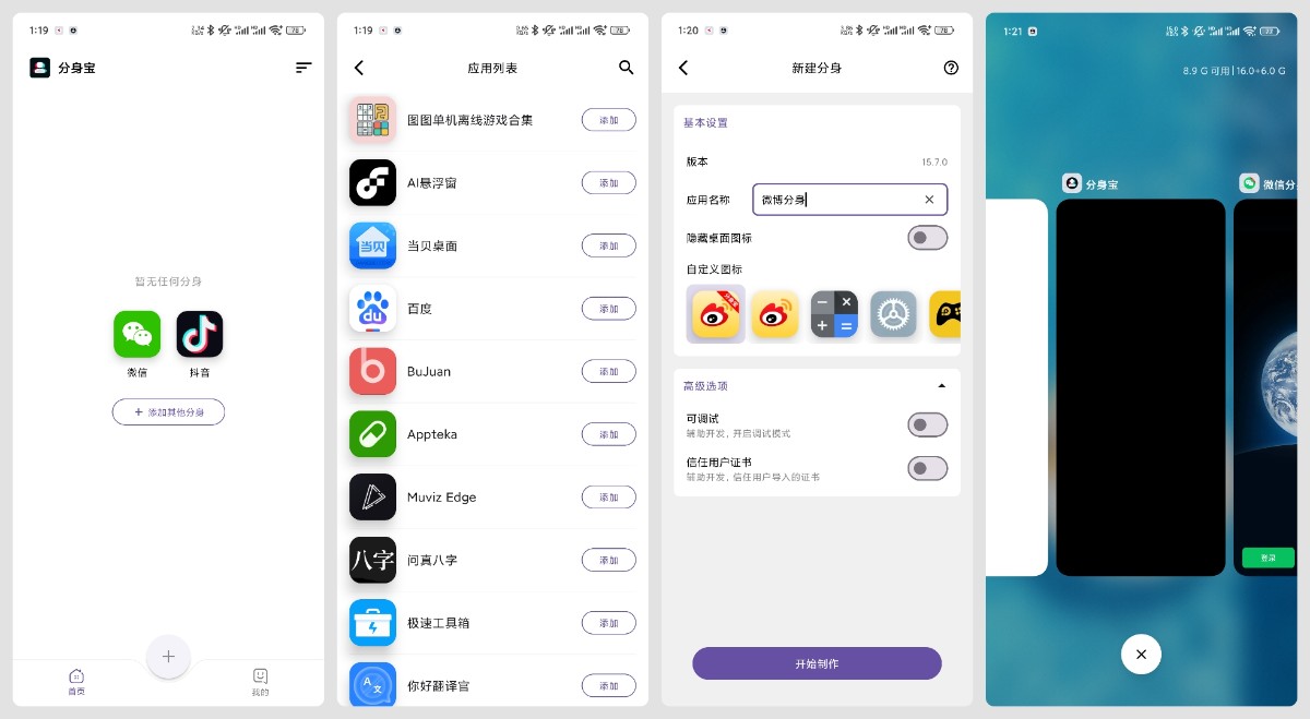 分身宝是一款轻松实现手机分身的APP,让您用一个手机即可玩转多账号。它可以同时登录多个社交软件和游戏账号,且各账号间互不干扰。操作简单便捷,只需一键切换,就能轻松管理多个账号,告别繁琐的账号切换过程,提高效率,解放双手。此版本已解锁VIP功能,为用户提供更高级的服务体验。网友评价指出,这款工具对于需要频繁切换账号的人来说非常实用,极大地提升了工作效率。