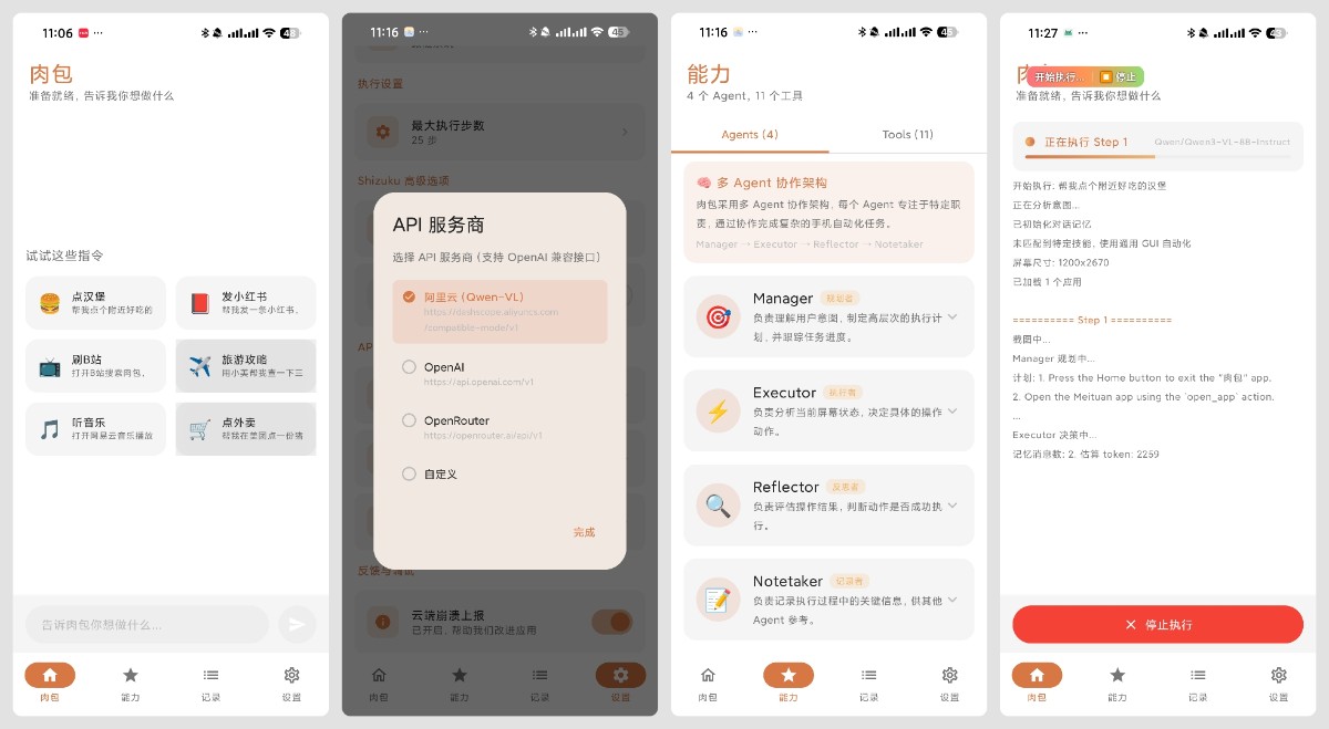Roubao(肉包)是一款完全基于Android原生开发的AI自动化助手,打破了传统手机自动化依赖电脑运行和技术门槛高的痛点。用户只需安装一个App,配置API Key后即可通过自然语言指令让手机自主完成复杂任务。该应用利用视觉语言模型(VLM)和多Agent协作架构,使手机能够“看懂”屏幕内容并理解自然语言指令,智能决策并自动规划操作步骤。此外,它还支持多种VLM预设API服务商,提供高度可定制性和安全保障。精心设计的UI,现代化Material 3设计语言,流畅的动画效果,深色/浅色主题自适应,并有完整的中英文双语支持。高度可定制,支持多种VLM(如阿里云通义千问、OpenAI GPT-4V、Claude等),一键切换API提供商,支持模糊搜索和本地模型配置。API Key使用AES-256-GCM加密存储,检测到敏感页面时自动停止任务执行,全程可视并支持手动停止任务。支持Root模式,当Shizuku以Root权限运行时,Roubao可以启用更多系统级操作能力。