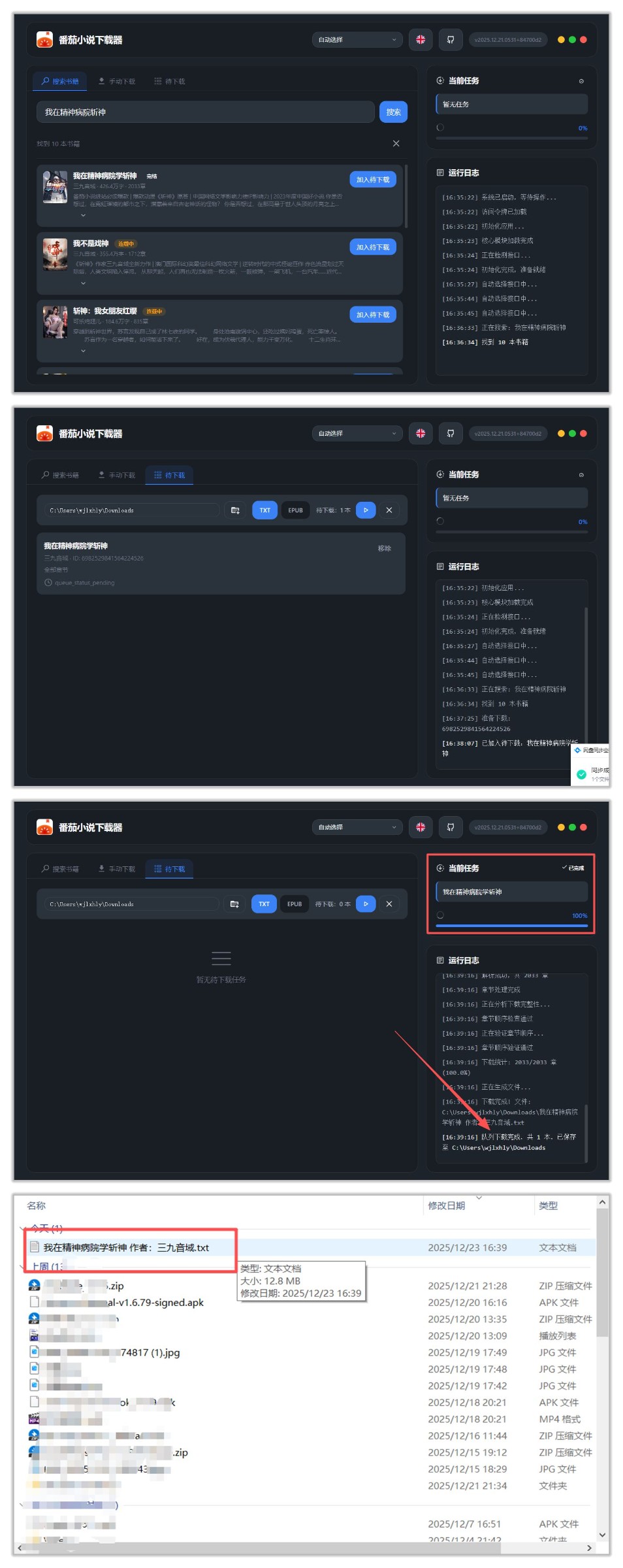 一个现代化、高效的番茄小说下载器,使用 Python 构建,配备简洁、响应式的网页界面。功能特性包括图书搜索(轻松按标题或作者搜索图书)、批量下载(一次下载多本图书)、格式支持(导出为 TXT 或 EPUB 格式)、封面图片(自动获取并在 EPUB 文件中嵌入图书封面)以及章节选择(下载完整图书、特定范围或手动选择的章节)。该应用非常适合需要高效管理大量电子书资源的用户。