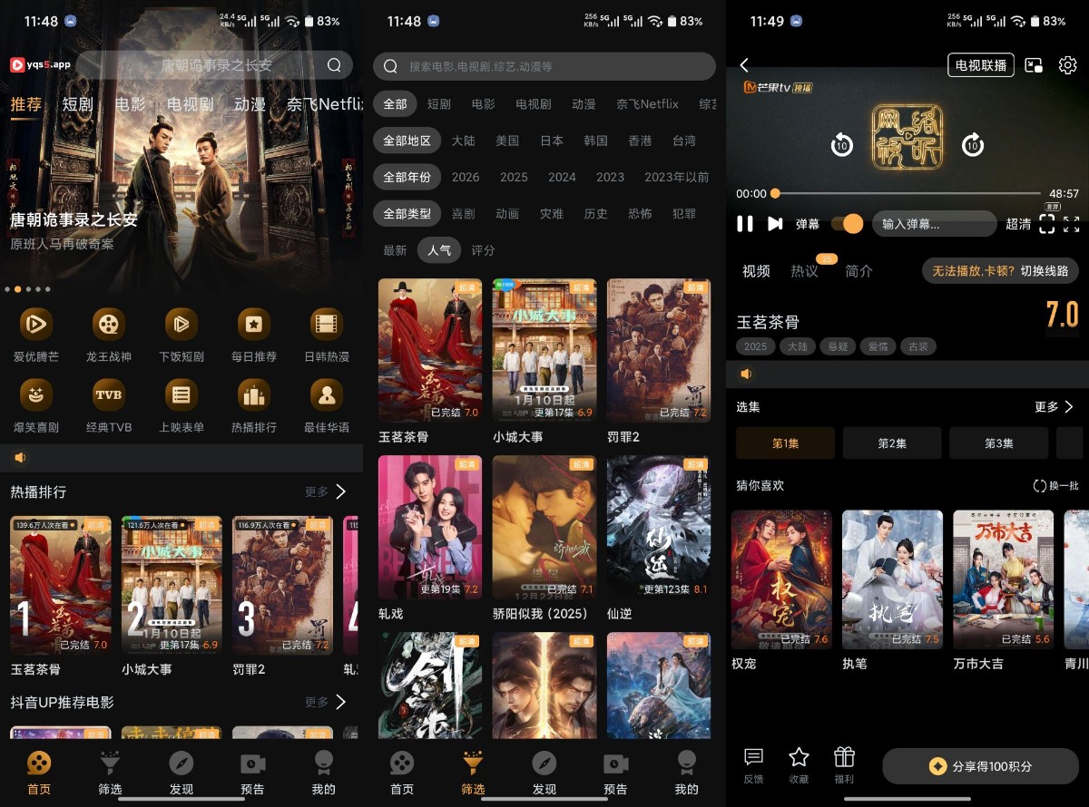 【使用说明】:一款免费的掌上影视追剧神器,提供 电视剧、电影、动漫、综艺、短剧等类型,热播 这里都有,通过关键词准确定位喜欢的影视,全 程无广告高清流畅播放,资源更新快,确保用户 能够第一时间观看最新剧集