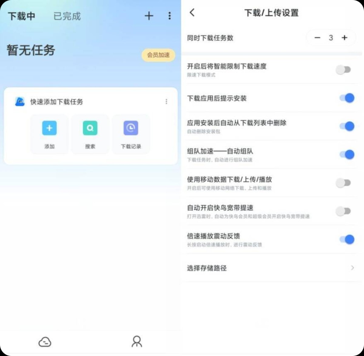 主页资讯流、短视频推荐、直播入口全部移除; 下载任务列表无弹窗、无横幅、无“看看视频领加速”诱导; 启动速度提升,告别“开软件先看3秒广告”的烦躁体验。