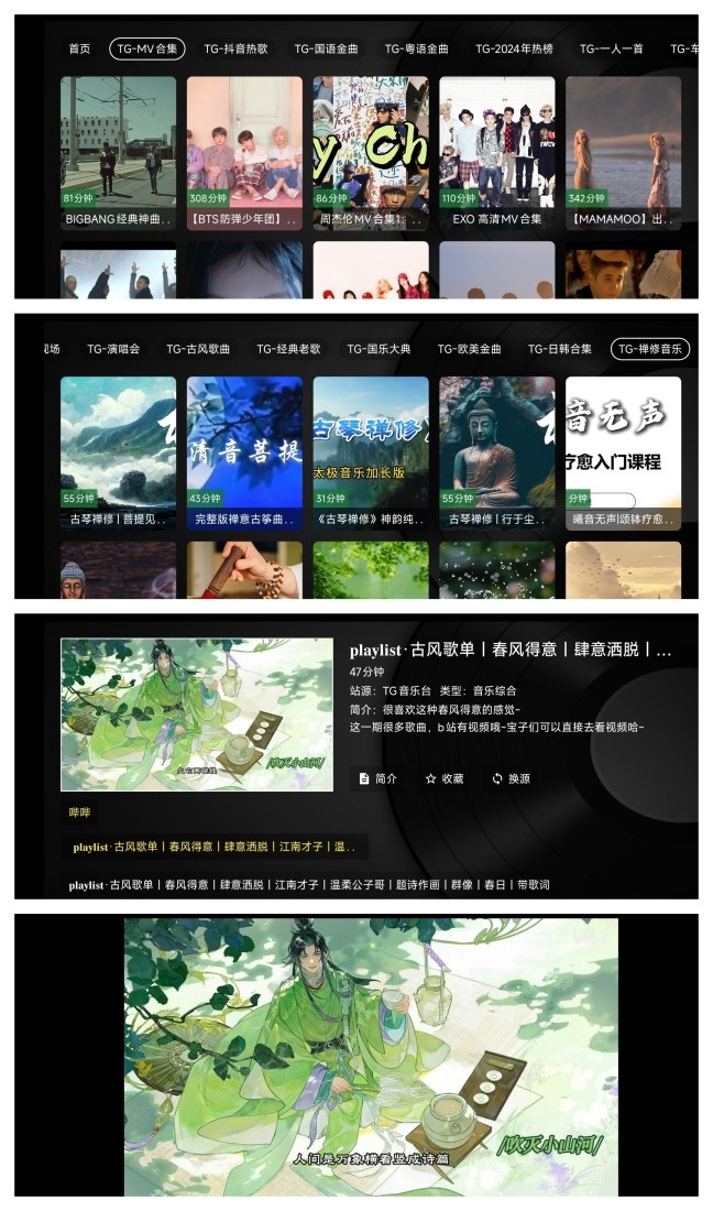 TG音乐台tv版是一款非常易于使用的音乐播放软件,能够很好地播放多种音乐,为用户提供更多便利。软件内呈现各种各样的音乐,用户可以根据自身喜爱的音乐类型聆听,并能下载喜欢的音乐。平台资源丰富,除提供基本歌曲资源外,还可观看MV,包含各类有趣的体育和广场舞主题,便于在大屏幕上练习。其资源大多来自bilibili,不必担心失效问题,实现了既能听又能看的功能。界面采用经典的开源shell界面,操作熟悉便捷。直接安装即可使用。