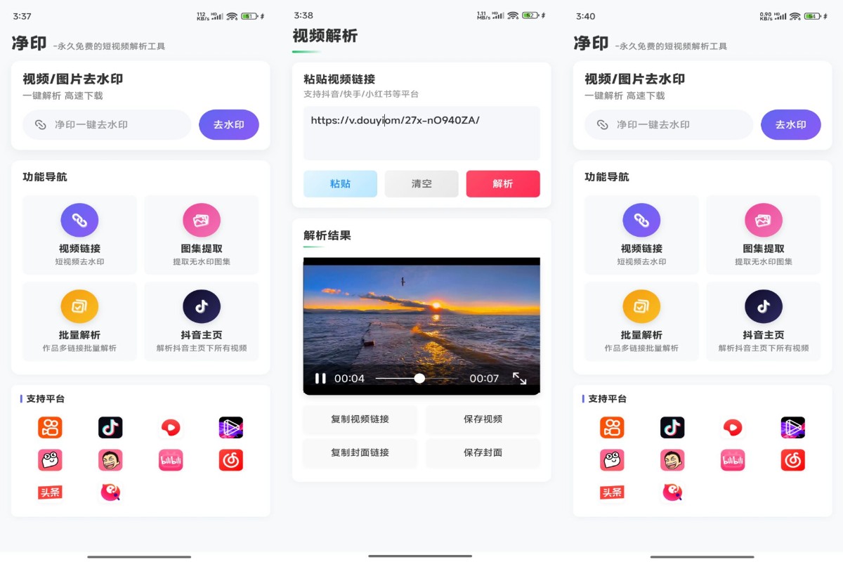 【软件介绍】:一款手机短视频处理App,去水印解析,轻松编辑!提供短视频去水印、视频解析、图集解析等多种功能,让你轻松处理短视频,创作个性化内容。界面简洁,操作便捷,是你的短视频创作好帮手!解锁VIP 去广告 去更新 简化布局 支持各大平台去水印解析批量解析图集视频