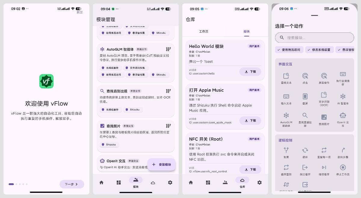 vFlow是一款专为Android平台打造的强大且高度可扩展的自动化工具。它采用图形化界面,用户能将一系列“动作模块”自由组合成“工作流”,以此自动执行各类日常重复性的屏幕操作任务。其核心设计思路是把复杂的自动化逻辑拆解为独立、可复用且易理解的模块,无论是简单的“每日签到”,还是涉及复杂条件判断与循环的“自动化测试流程”,vFlow都能提供直观、灵活且强大的操作平台。