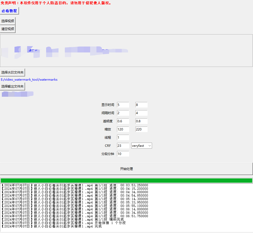 - 开始处理:开始批量水印处理。