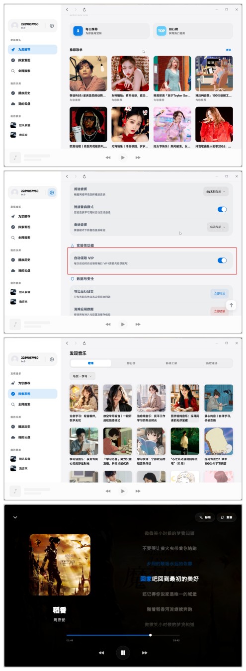 EchoMusic是一款专门针对桌面端开发的第三方酷狗概念版音乐播放器,具备简约、精致且功能强大的特点。它基于Material Design 3进行设计,支持深浅色模式,能很好地适配桌面端大屏,为用户带来出色的视觉体验。其核心特性丰富多样,涵盖极致美学,通过Material Design 3设计优化大屏体验并支持深浅色模式;多维探索,可实现歌曲、歌手、专辑、歌单全方位搜索,方便用户快速找到喜爱的旋律;进阶播放,拥有高潮片段标记(Firefly效果)、播放进度精确控制以及播放队列管理等功能;歌曲详情与评论,允许用户查看歌曲详细信息以及其他用户的评论;歌词复制,支持一键将完整歌词复制到剪贴板,并能用ESC键快速关闭歌词页。登录酷狗账号即可。